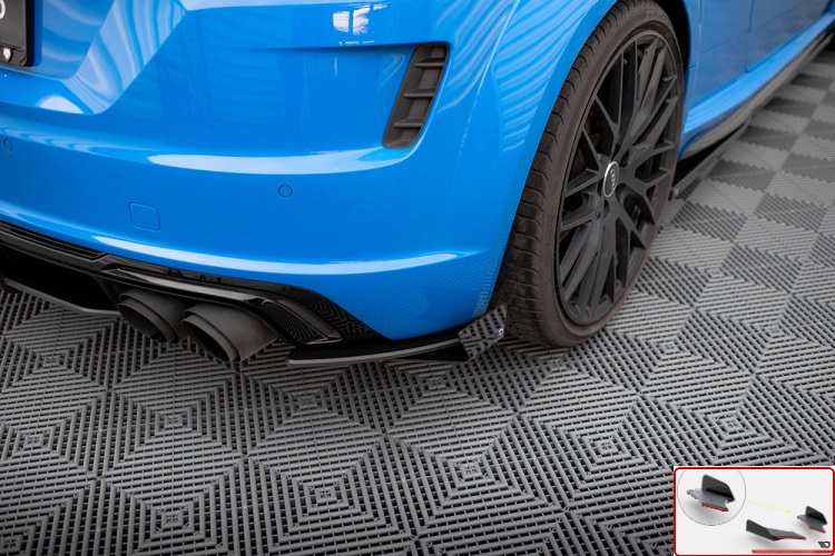Coppia appendici diffusore posteriore street pro nere con bordo rosso e flaps neri lucidi Maxton Design per Audi TTS 8S restyling (2018-2023). Il prodotto viene fornito in rifinitura nera opaca racing con bordo rosso e flaps neri lucidi.