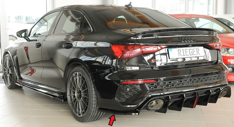 Coppia appendici diffusore posteriore sportivo di colore nero lucido, compatibili con Audi RS3 8Y pre-restyling (06.21-05.24) sportback. Il prodotto è compatibile solo con il diffusore sportivo Rieger Tuning. Il materiale con il quale viene prodotto è ABS di qualità, made in Germany, e testato per un'elevata resistenza agli urti.