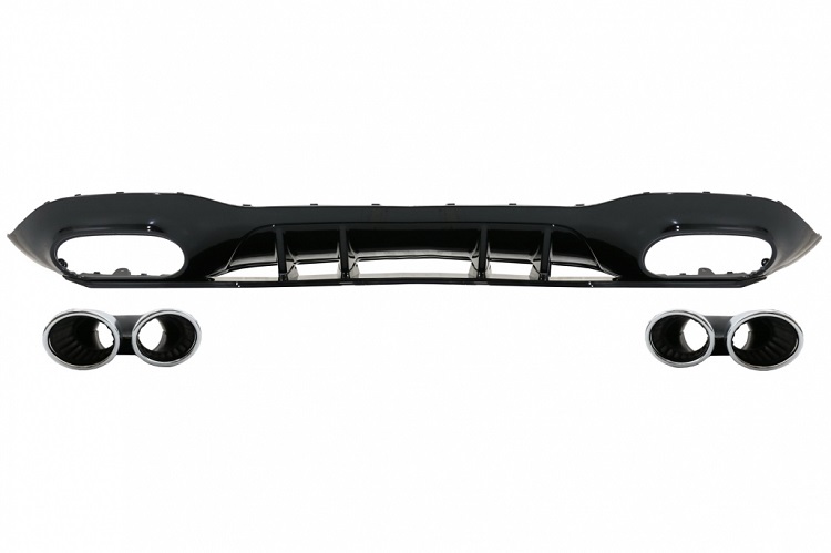 Diffusore sportivo posteriore per Mercedes Classe A W177 (2018-) con AMG-Line. Questo diffusore, di colore nero, dona sportività all'auto; viene prodotto in ABS, monta su paraurti sportivo amg line di serie. Comprende anche i 4 finalini estetici cromati.