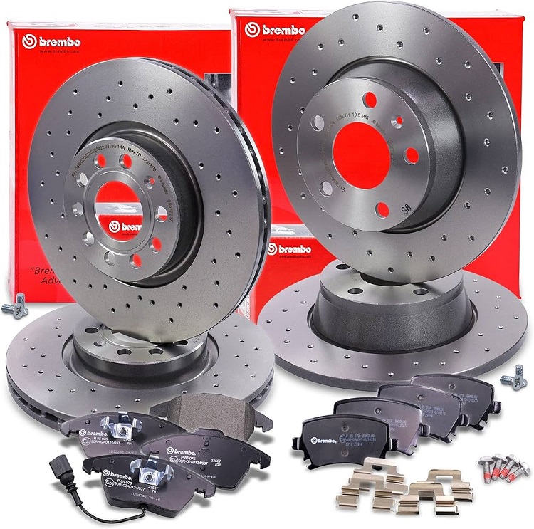 Kit freni Brembo completo composto da: coppia dischi sportivi forati anteriori + coppia dischi sportivi forati posteriori + set pastiglie anteriori con sensore usura + set pastiglie posteriori per Audi A3 8P 2.0 TDI 140CV e altri modelli, chiedere compatibilità prima dell'acquisto. Immagine illustrativa del prodotto.